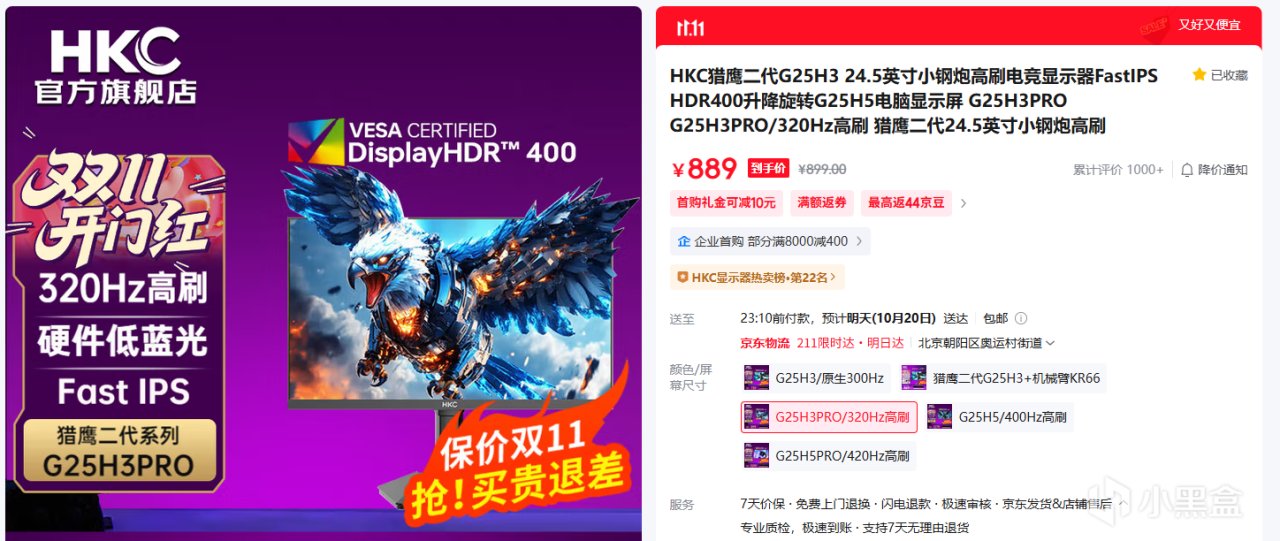 再加上HKC自研的DIC技术和三种游戏情景预设,增强运动画面清晰度的同时, 还能减少拖影,提升y'x't'y并且屏幕使用了FHD高清技术,还支持178°的广视角调节,即使是宿舍党和租房党也能有一个很好的体验。最后如果预算实在有限的话还可以选择猎鹰二代的低配版本G25H3,价格只要739。