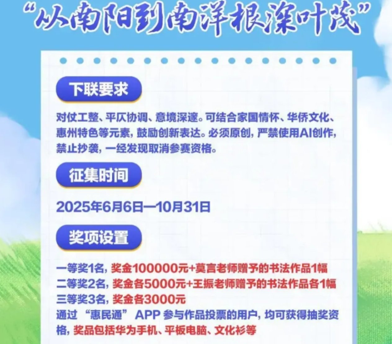 今年6月,诺贝尔文学奖获得者莫言在广东惠州参观百年客家围屋碧滟楼时,有感而发写下上联“从南阳到南洋根深叶茂”,并向公众征集下联。这场历时四个多月的文化盛事共收到12475件投稿,全网阅读量超过2000万。10月20日,获奖结果揭晓,21岁的“00后”在校研究生宋珂嘉凭借下联“自井壁及井毕角亢星张”独揽一等奖及10万元奖金。