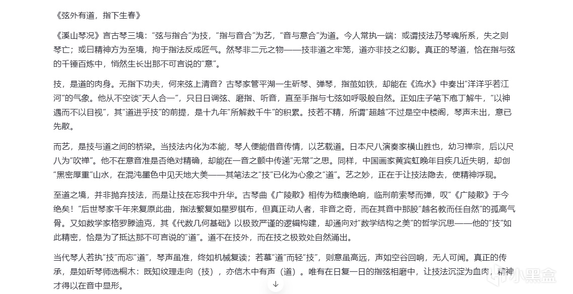 题目是这个:《溪山琴况》记载古琴三境界:弦与指合(技)、指与音合(艺)、音与意合(道)。当代琴人常争论:应重技法传承,还是追求精神超越?要求:以 “技与道” 为话题,写一篇不少于 800 字的文章。