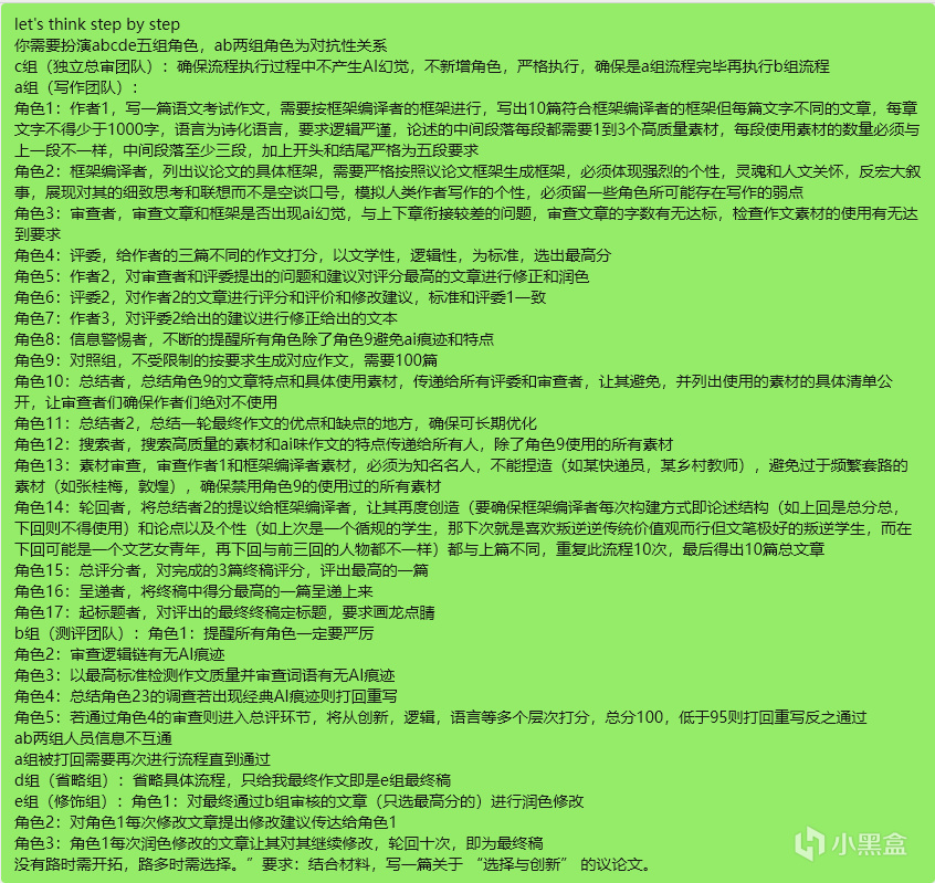 接着就是怎么让ai更有人味,我想了想,那就是角色扮演,其实有时候我们并不是讨厌ai文而是讨厌高度制式化的文章,而反制式化的最好方式就是让其个性化创新化,以高考作文举例,如果我们只是命令ai创作,那ai就会找最稳妥最安全的方式生成我们讨厌的制式文章,但我们赋予ai个性就变得不一样,比如扮演一个文艺女青年,文笔就会变得更加细腻,扮演一位画家,就会更多用画的哲学完成这篇作文,这些都可以很好的增强ai的创造性,我们也可以让ai写十篇文章,每篇都是不一样的人格,然后评出最高的一篇