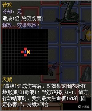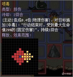 红色是技能的释放覆盖范围,黄色是效果覆盖范围,喷毒是一个“周围2格”效果范围的群攻技能,击中附带“中毒”异常状态。再结合黑鳞蛇的天赋: