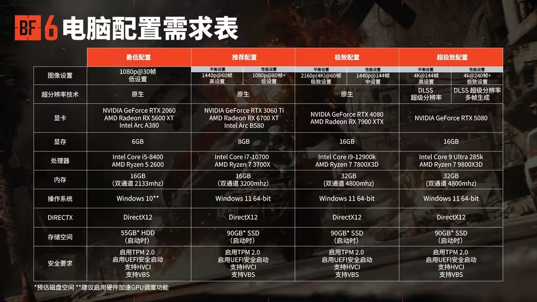 最近新出的几款游戏,配置要求都不低,比如《战地6》《消逝的光芒:困兽》,普遍起步都得RTX 2060,想在2K分辨率下原生60帧运行,至少得RTX 5060。