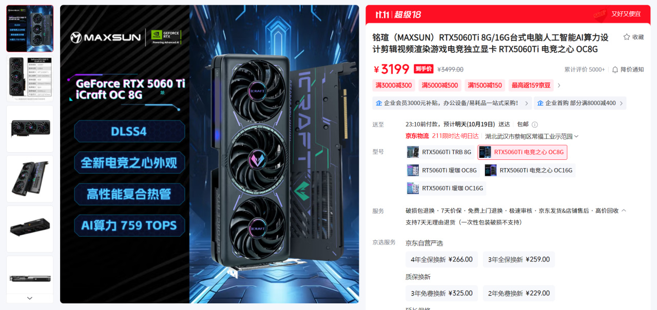 5060Ti价格普遍在3200~3600元,目前稍贵,但也有能做到3199元的铭瑄电竞之心,相当划算,可以买。