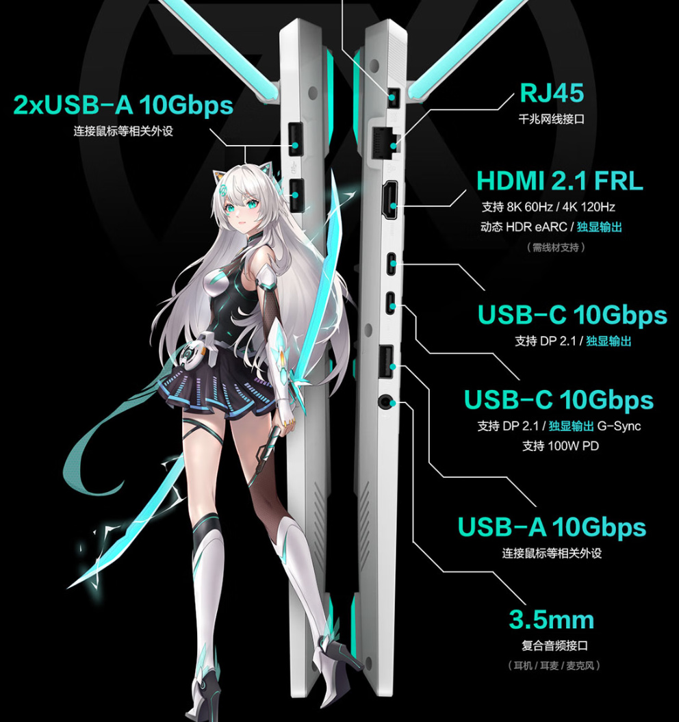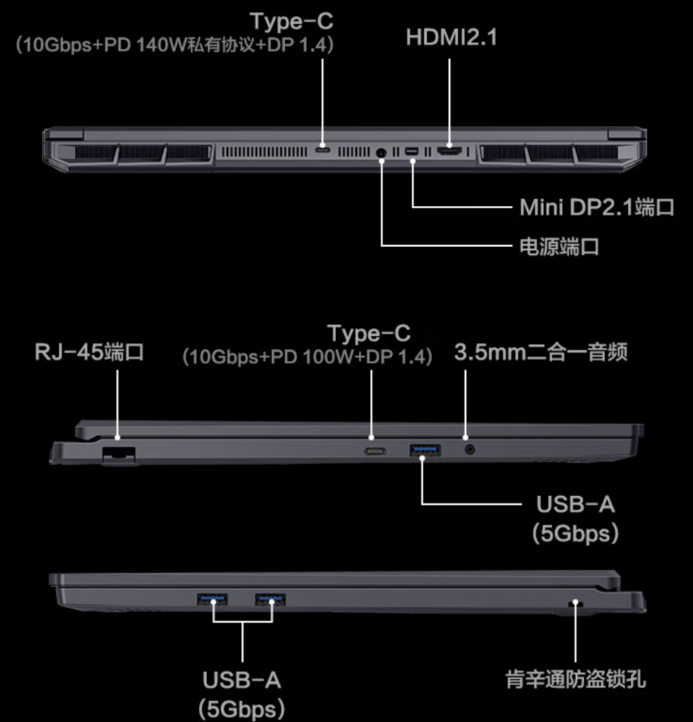 接口方面,3个A口、2个C口,是御三家里最多的,C口支持显卡输出和100W PD充电,还保留RJ45网口,好评。
