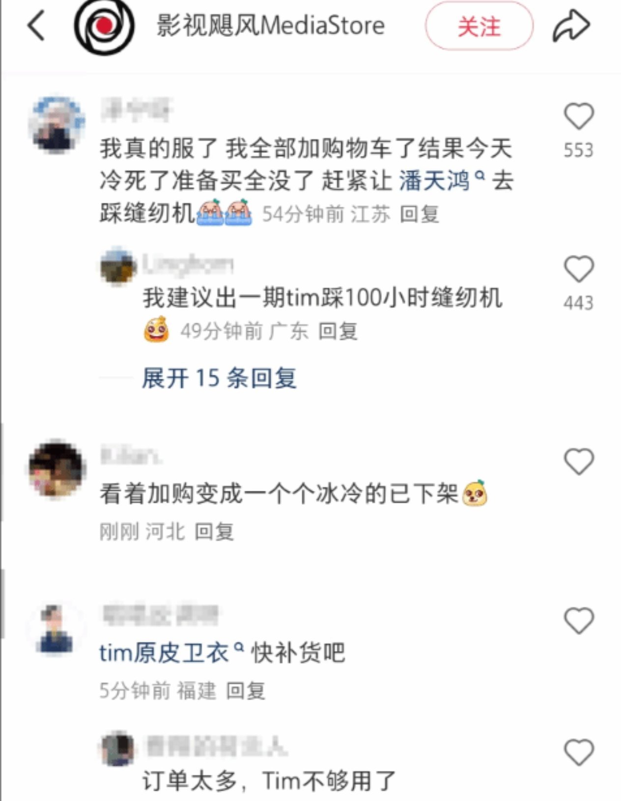 影视飓风商店在公告中表示,这次“爆单”完全超出团队预期。为尽可能满足发货时效要求,公司决定暂停大部分商品的销售,集中力量处理积压订单。商店预计在10月26日20:00恢复正常售卖。这则公告引发网友热议,有人调侃道:“我全部加购物车了结果今天准备买全没了,赶紧让潘天鸿去踩缝纫机。”还有网友建议“出一期Tim踩100小时缝纫机”的视频。