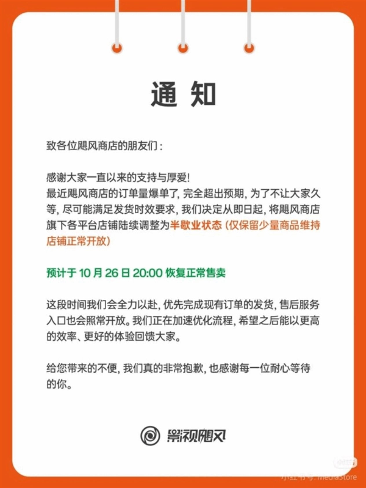 知名视频博主Tim(潘天鸿)创立的“影视飓风”商店发布公告称,因订单量远超预期,旗下各平台店铺从即日起陆续进入半歇业状态,仅保留少量商品维持运营。