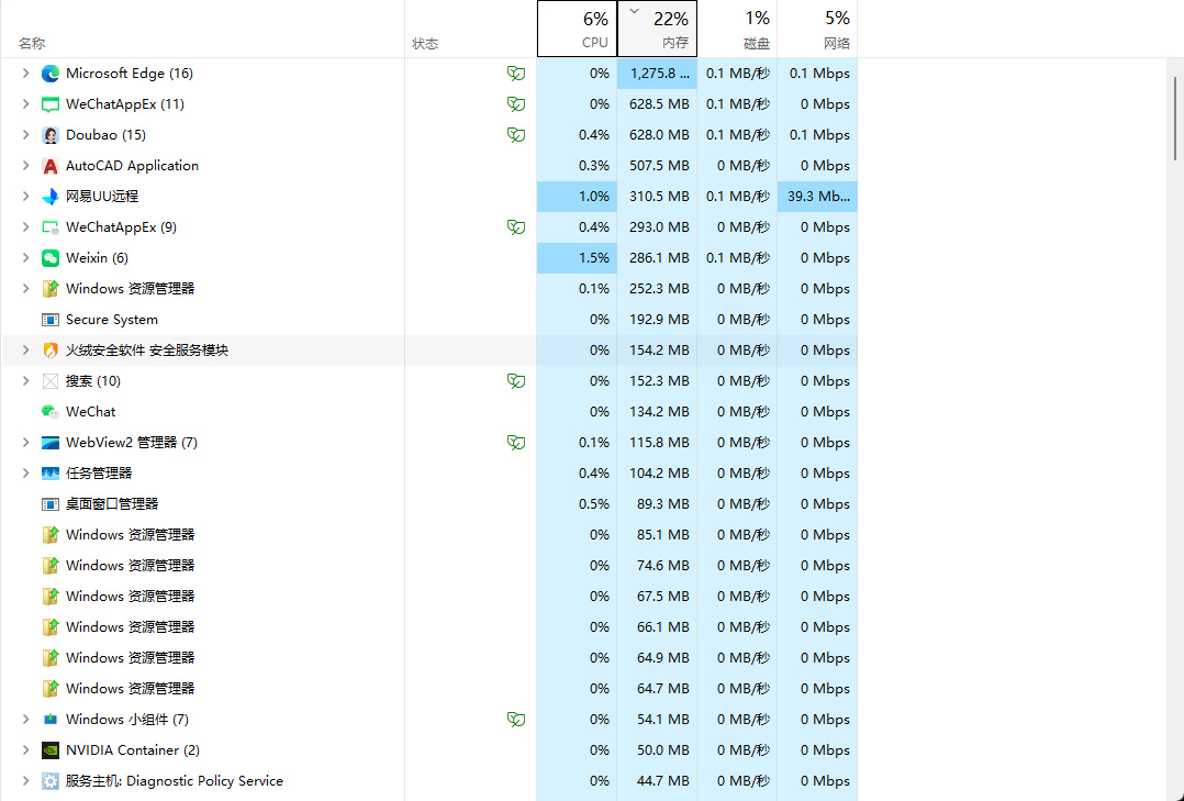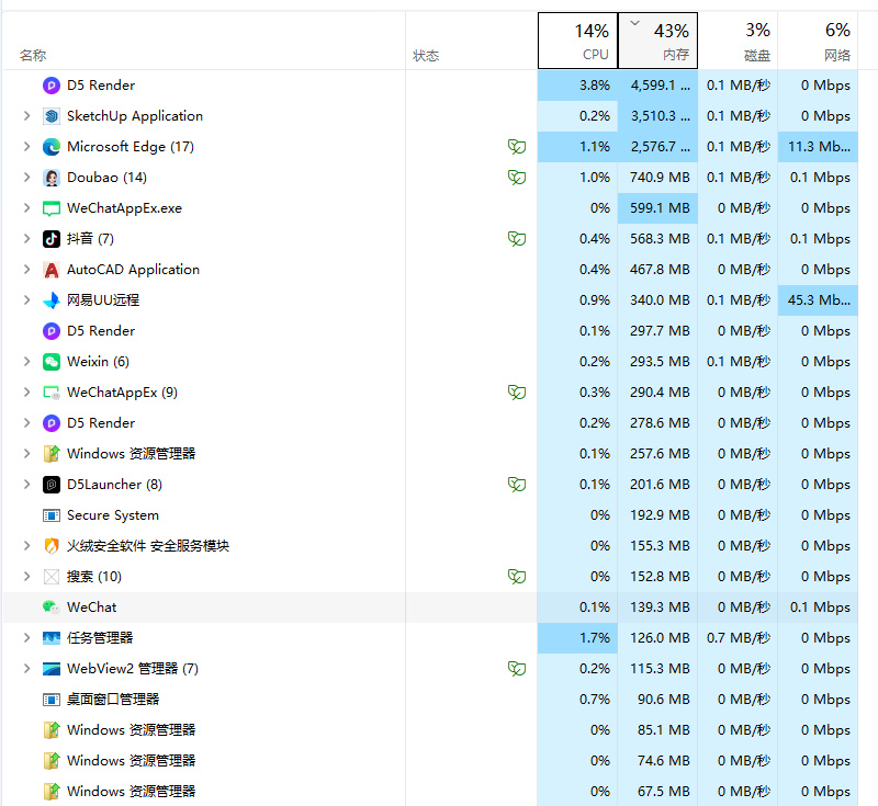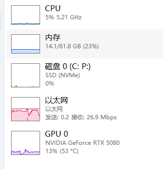 這個是我打開了一線日常常用軟件之後的內存佔用,可以看到,佔用已經來到了14.1GB,如果是16G內存搭配,已經到快要爆內存的局面,所以說如果日常使用Windows11的話,16G已經有些瓶頸,16G以及以下的配置,建議安裝Windows10使用,並且Windows近期停止更新,以後也不會有更新並重啓的等待煩惱。