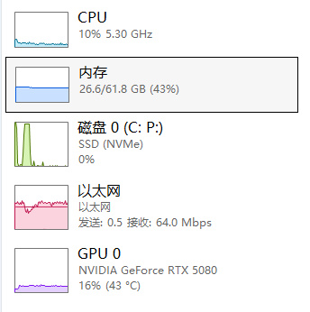 再開一些我日常辦公使用的軟件,內存佔用直接來到了26.6G,這個時候把虛擬內存拉高一點,屬於剛好夠用的狀態,把這些辦公軟件換成遊戲,佔用其實差不多,像《都市天際線2》32G內存一般可以帶到50-60萬人口,再多掉幀嚴重,64G可以帶動百萬人口以上;甚至19年發售的《荒野大鏢客2》,也可以喫到20G以上內存。