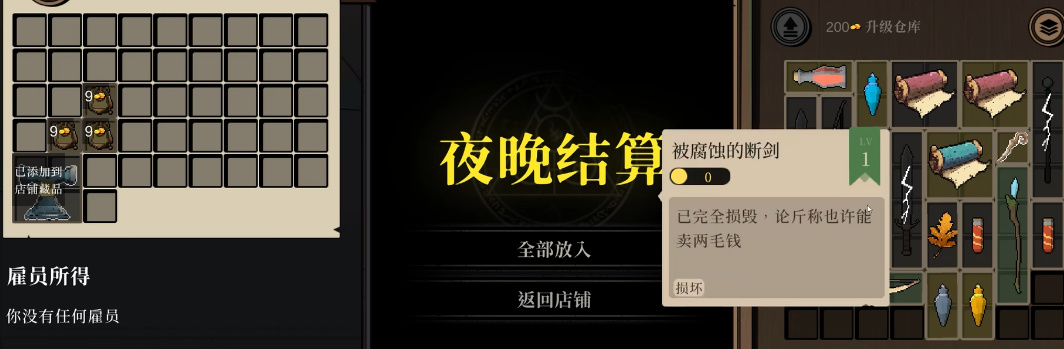 在他離開酒店後,你會收到通知,附近的鐵匠鋪都遭到了洗劫,於是乎長劍就變得更好賣了,你在夜晚的探索就需要留格子給長劍~