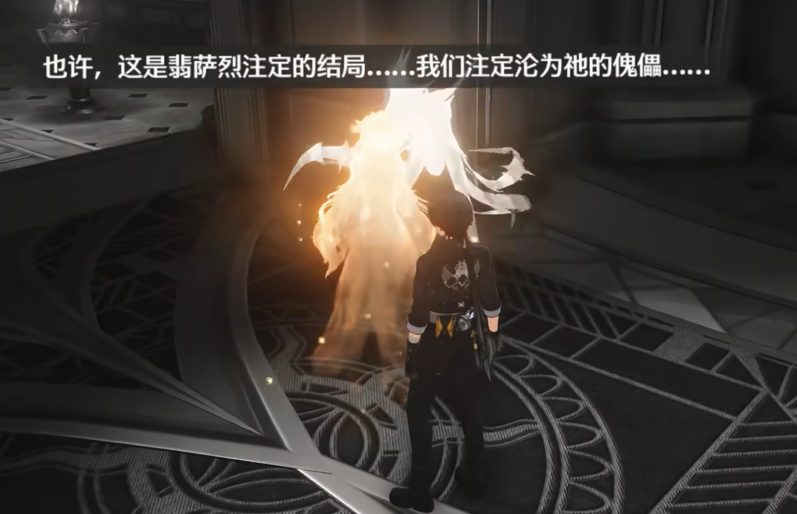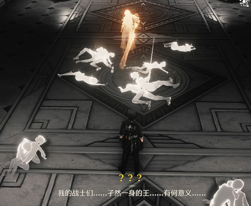 坎特蕾拉和她的家族,最終沒能抵抗鳴式的低語,她的族人全部殘像化,這位堅強的聖女希望不再,絕望的認同了悲慘的命運,或許這就是翡薩烈註定的結局,說完這句遺言的她被殘像層層包圍,如圖喪屍羣裏的羔羊被亂刀砍死,世間不再有翡薩烈,只是黑潮裏突兀出現了一羣敵人,其中的一隻殘像似乎喜歡打着紫色的傘。