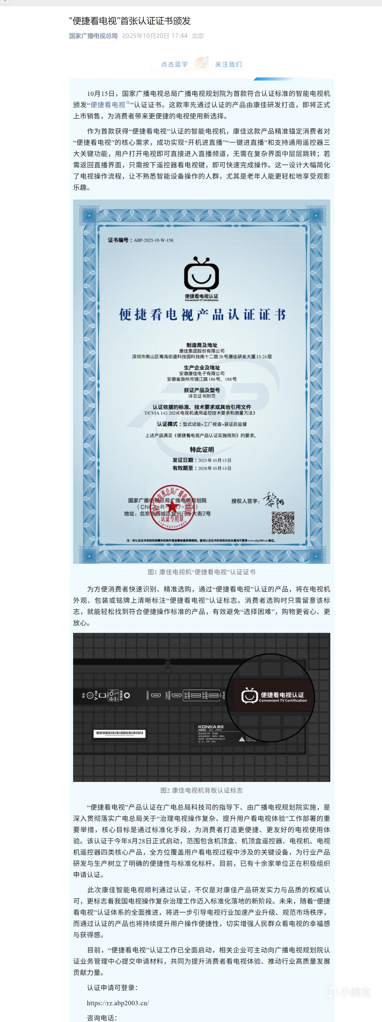 10月15日,国家广播电视总局广播电视规划院为首款符合认证标准的智能电视机颁发“便捷看电视”认证证书。这款率先通过认证的产品由康佳研发打造,即将正式上市销售,为消费者带来更便捷的电视使用新选择。