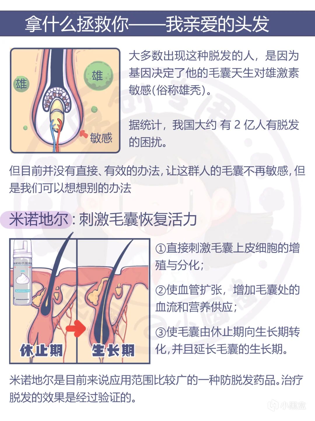 2、及時使用米諾地爾:有脫髮困擾者可使用米諾地爾,尤其適合經常熬夜的人羣。頭髮生長期平均爲 3 年,因此米諾地爾需至少使用 1 年;若急於看到效果,可選擇第二代米諾地爾泡沫劑,其能跨細胞滲透毛囊,吸收更快,通常使用 8 周後可評估效果。