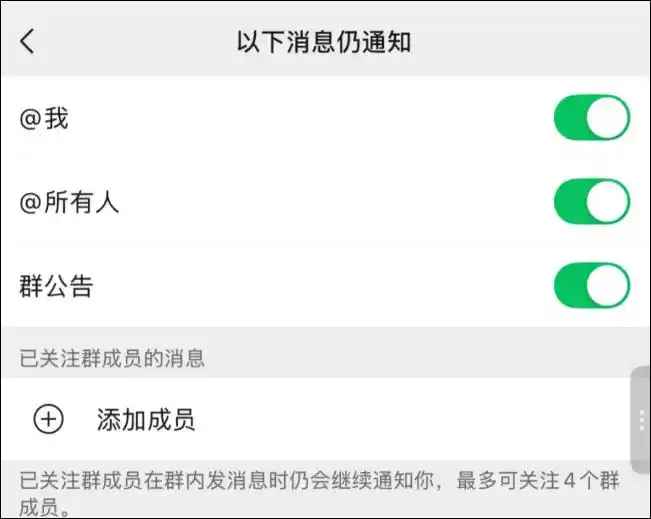 許多用戶長期抱怨被拉入羣聊後即便開啓“消息免打擾”,仍會因被 @ 或羣公告而被打擾。爲此,微信在灰度中將羣聊設置中的“關注的羣成員”選項替換爲更明確的“以下消息仍通知”模塊。新界面把常見導致打擾的三類消息——@ 我、@ 所有人、羣公告做成獨立開關,開啓則會收到通知,關閉則徹底實現勿擾。