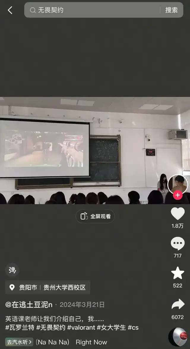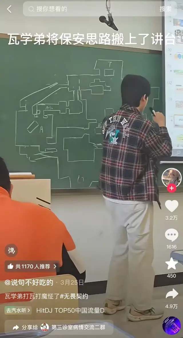 瓦在成了个新的社交名片。比如抖音上有个爆火视频,讲的是老师让上台分享在校最快乐的事,然后有个男大就发了自己打瓦的五杀视频。而在评论区,能发现有网友认出了“这是隔壁班的某某”,等他们再见面时,很可能因此聊起来、约一起打瓦。