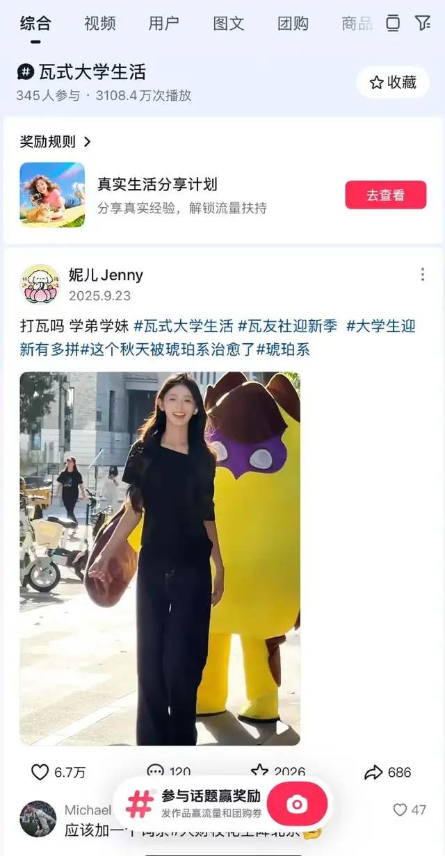 其实,从某种意义上说,短视频时代让“分享生活”变的更容易,而大学生本身也是社交与表达欲爆棚的一个群体,再加上瓦潮流的调性和有趣的文化底蕴,成为大学生创作与分享的“源泉”也是一个很自然的事情。