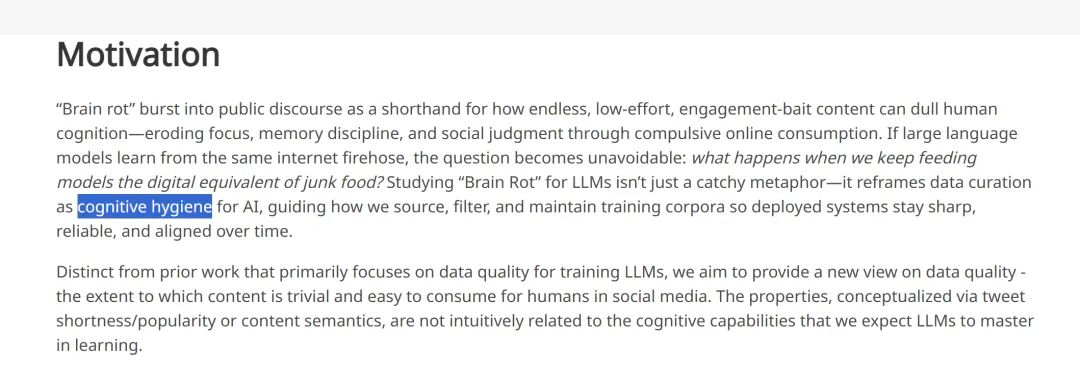 大概意思是如果模型长期接触琐碎、无挑战的网络内容,就会像人类一样出现认知下降。