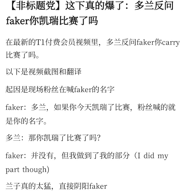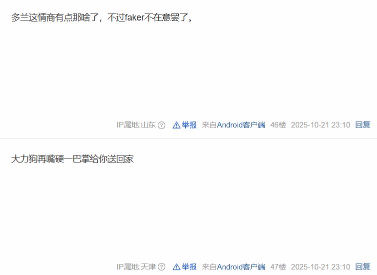 这段对话片段一经流传,便迅速在国内平台引发热议。相关帖子浏览量破万,许多网友称赞Doran“不惯着大飞”,认为他的直率很解气,体现了年轻选手的个性。例如,有帖主写道:“多兰这情商,怼得Faker哑口无言,但又不失可爱!” 还有网友分析:“有没有可能真心话一般都以开玩笑的方式说出来”,暗示Doran可能在委婉表达对Faker的“不满”,但更多是粉丝间的脑补。