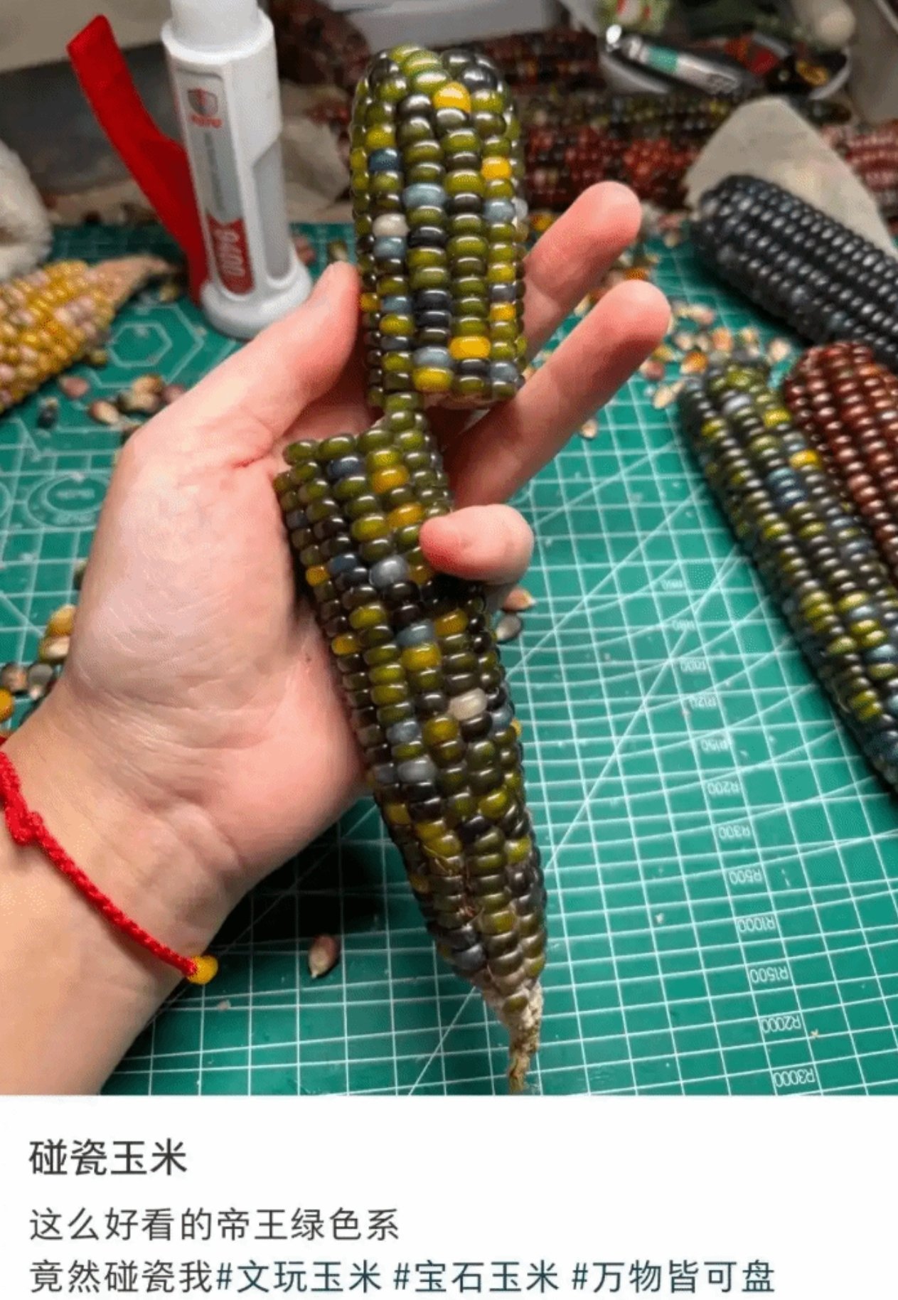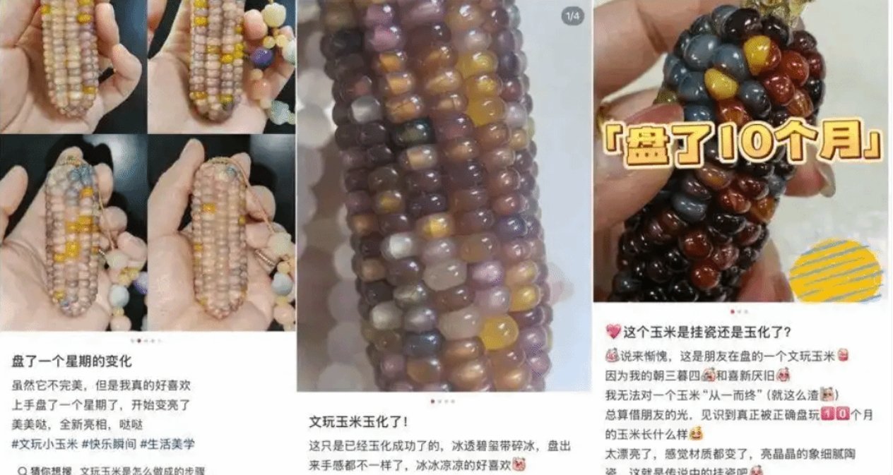 文玩玉米多为特殊培育的观赏品种,颗粒坚硬、颜色独特,不适合食用但适合把玩。盘玩过程中,玉米会逐渐形成包浆,产生“玉化”效果,这一过程为年轻人提供了确定的情绪价值——付出时间即可看到变化,成为对抗现实不确定性的解压方式。