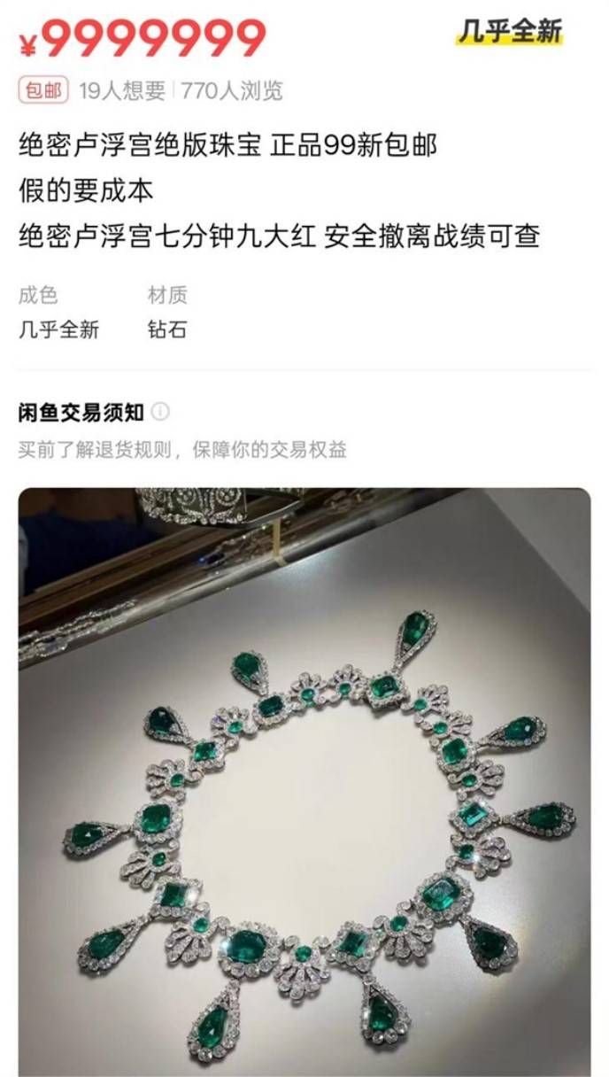 法国卢浮宫博物馆10月19日发生重大盗抢案后,国内二手平台闲鱼上出现多个售卖“卢浮宫被盗珠宝”的链接,标价从99万元到9999万元不等。商品描述中“9.5新,现货在手、刚取货,低价急出”等文案引发关注。