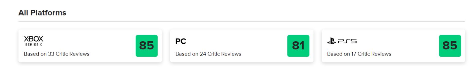 Metacritic(PS5端收录17家媒体评分,Metascore85分;Xbox端收录33家媒体评分,Metascore85分;PC端收录24家媒体评分,Metascore81分)