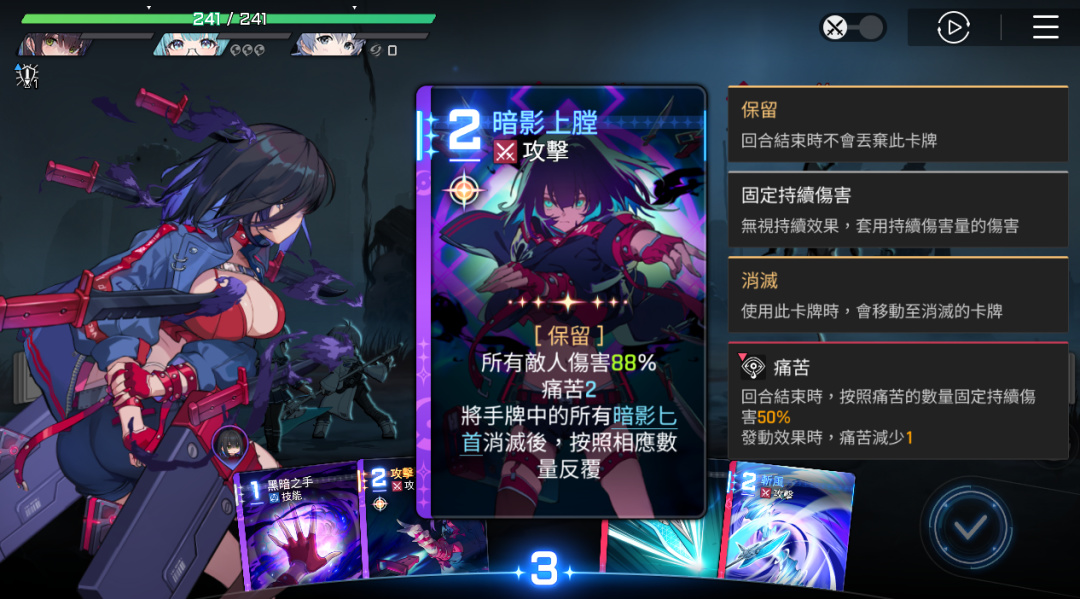 如果要說缺點,其實目前國際服也存在一定的不足之處,多在具體單場戰鬥內。比如卡牌描述機制不清晰。比如“痛苦”詞條是給敵人施加一個Debuff,但結算的具體卡點和疊加上限等要素,遊戲並沒有解釋得太清楚,可能玩久了會自然清楚,但對剛開始接觸的新人玩家多少會產生一些障礙。