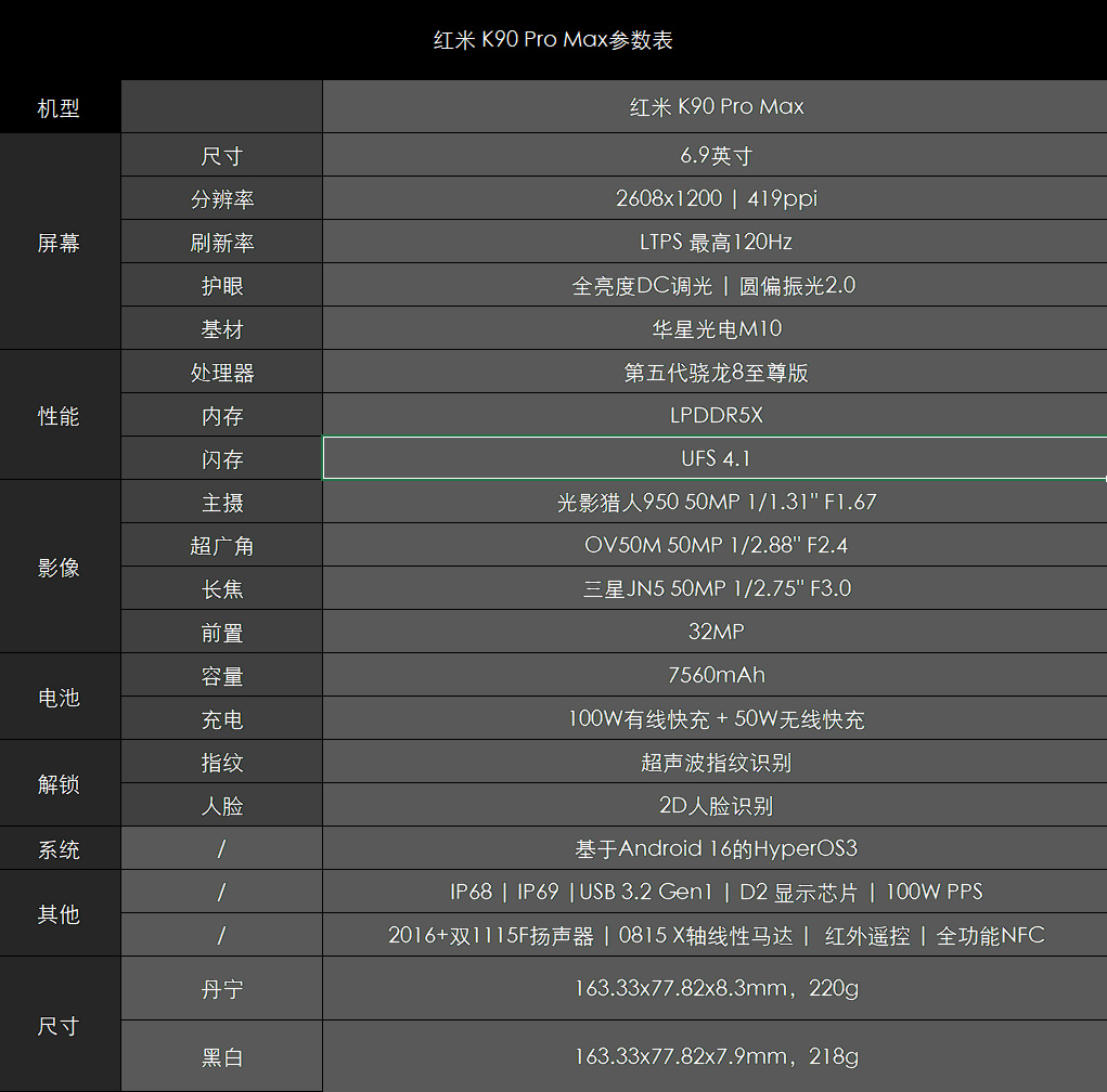 其他方面,IP68/IP69、超聲波指紋,紅米K90 Pro Max也一個沒少,連USB都上了違背祖宗的USB 3.2 Gen1,在補齊影像短板之後,現在的紅米K90 Pro Max真的是全面旗艦了,以前我們叫紅米旗艦守門員,但現在,可能有些旗艦還真打不過紅米。