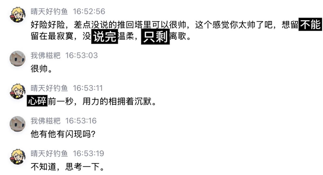 看着好友打出下飯操作時的調侃“很失望”“答辯配合”,在AI視角里已經爲隊伍發展埋下了“溝通嚴重斷層”“被負面情緒主導”的種子,最終導致戰局崩潰。