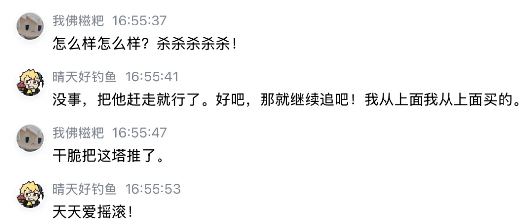 戰至酣處,語音頻道熱鬧程度堪比大型菜市場,有人彷彿未開智,有人又是金句頻出。明明隊伍裏都是活人,翻着聊天記錄卻看出幾分僞人才有的幽默感。