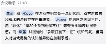 AI紀要是騰訊會議今年推出的新功能,能夠實時歸納總結會議內容,遇上不開會只開黑的遊戲玩家,會議紀要就變成了一份事無鉅細的戰後覆盤報告,團隊溝通、隊伍協作、戰敗原因種種全都記錄在內。