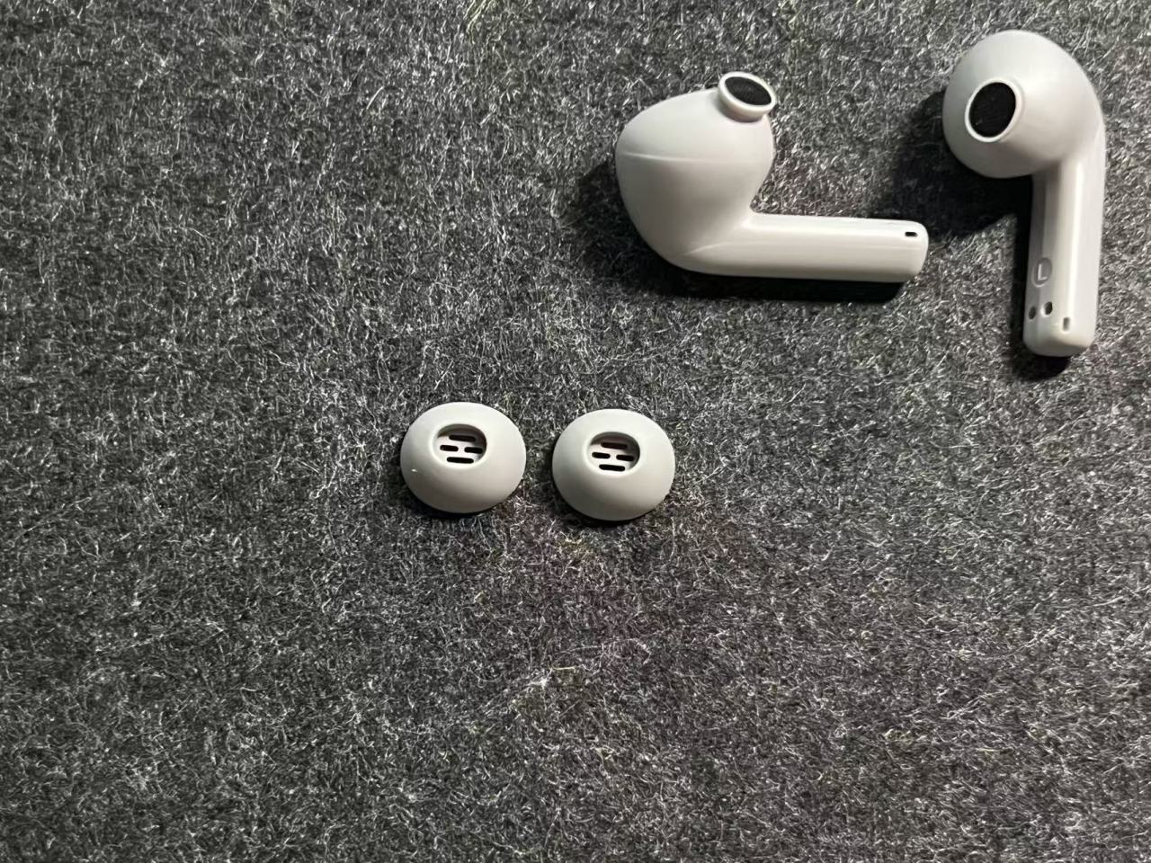 耳机是pods造型,全磨砂塑料材质,椭圆形腔体,硅胶耳套带滤网。到手晒单会送三对聚氨酯材质耳塞套(数量有限),较硅胶套能被动提升隔音效果,佩戴也更舒适。