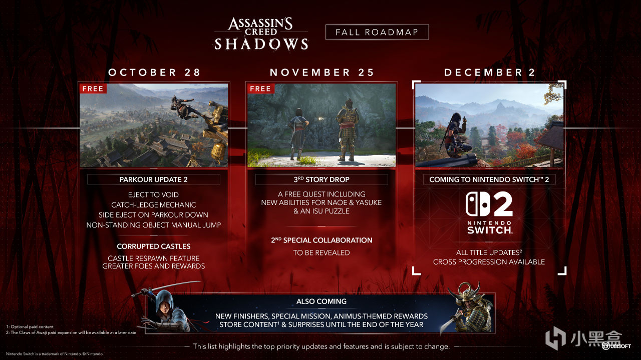 《刺客信條:影》將於12月2日登陸 Nintendo Switch 2。它將包含全部近期更新和免費內容,《淡路之爪》 擴展包除外(該內容將於明年稍晚時間推出)。它還將支持與Ubisoft Connect的跨平臺進度同步功能,因此您可以隨時延續自己的冒險進度。Switch 2還新增觸屏遊玩功能,支持在世界地圖、商店與藏身處等菜單界面中使用觸控操作。