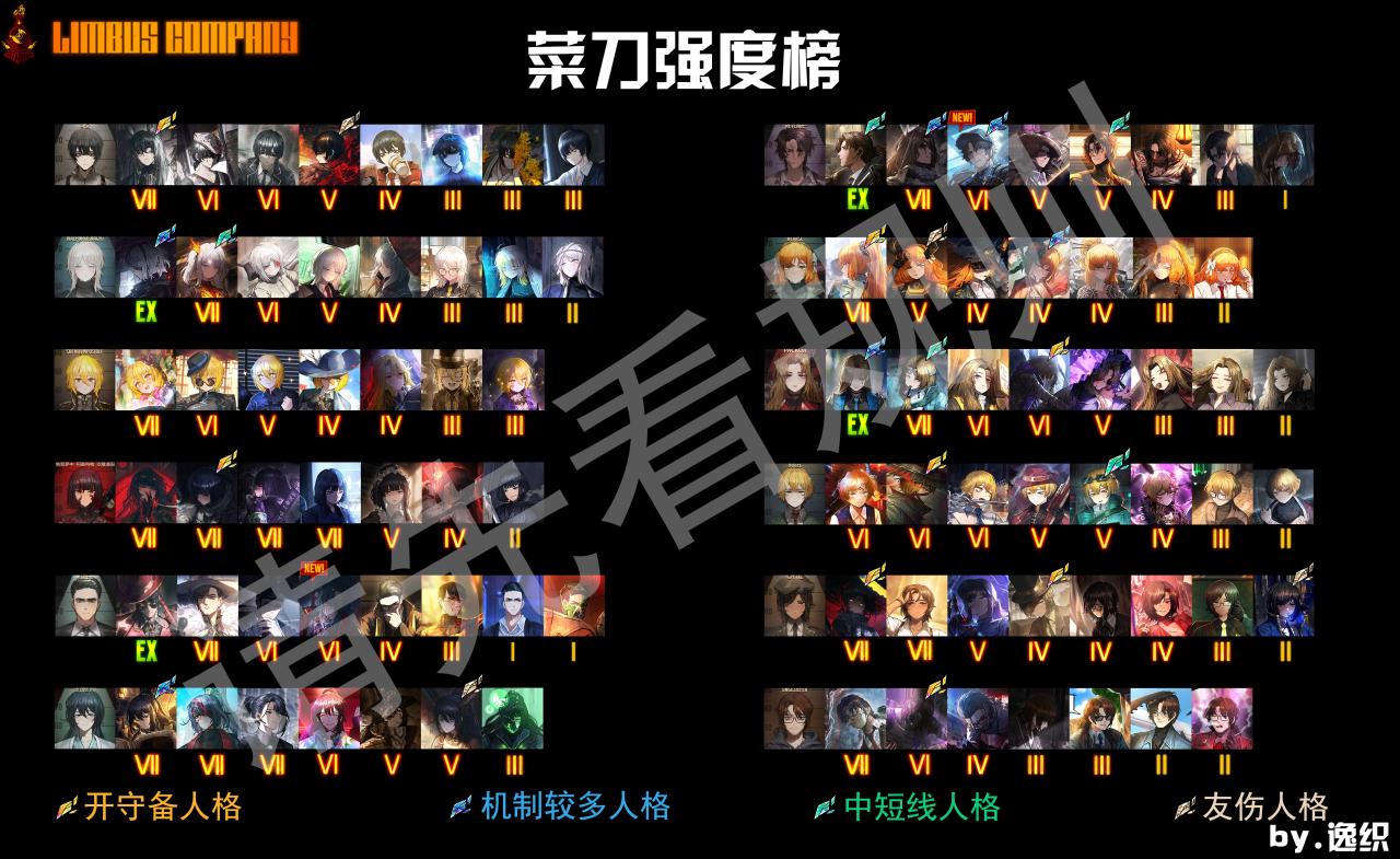 榜单为计分制菜刀榜,以牢外单槽对单六回合循环点数伤害为主,十二回合循环为次计分,不考虑体系、特定队友与ego辅助,点数伤害计算攻防等级,考虑牌序与理智,点数过低扣分,肉度与泛用辅助加分,流血沉沦破裂默认叠不到下回合,烧伤震颤层数消耗仅计算自身触发的,不进行可能造成友伤的循环,所有对群,广域乱射,可拼点反击技能按照一般对单技能计算,队友默认每回合提供每种罪孽资源各1个,仅给需要罪孽共鸣的人格提供2共鸣,给需要debuff增伤的人格2种debuff,人格强度仅体现在此规则下,不具备任何参考意义。