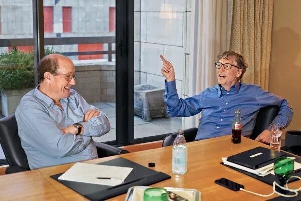 身处纽约四季的比尔盖茨、落地玻璃门外就是贝聿铭操刀,由米色大理石和三角灯笼守护的露台