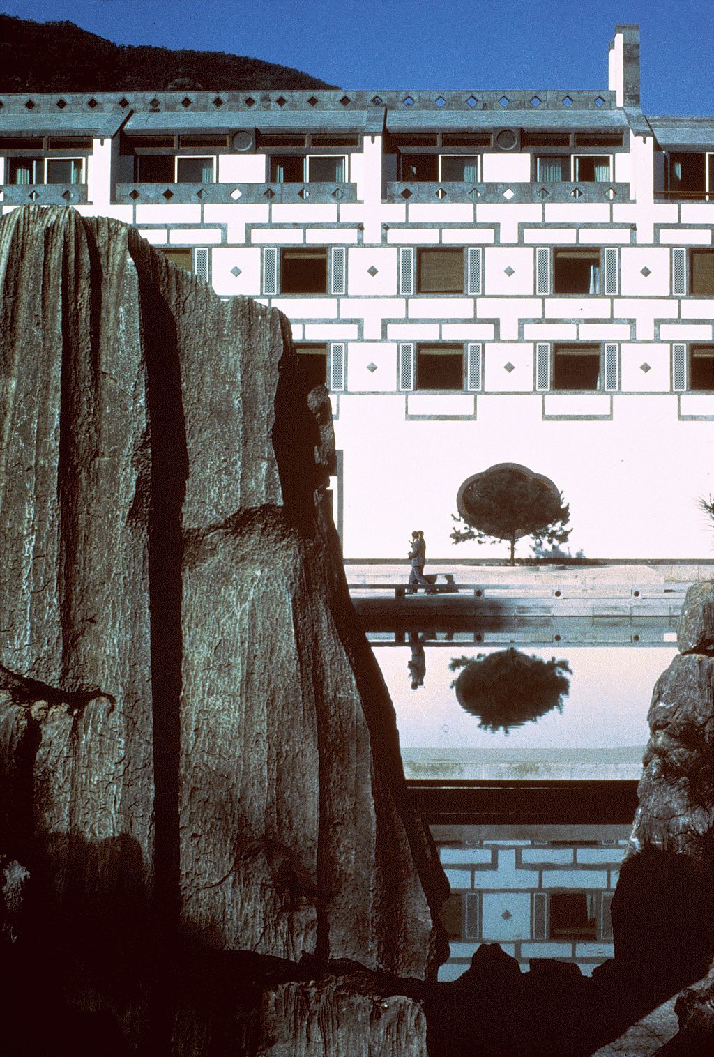 在贝聿铭心中,香山饭店是他的一份“深情告白”。当上世纪八十年代初的建筑界沉迷于摩天楼与观光电梯所代表的“现代化”喧哗与迷思时,他却选择回归最本真的中国文化基因。他没有竖起炫耀技术实力的庞然巨物,而是让建筑谦逊地匍匐于香山脚下,通过蜿蜒的鹅卵石径、静默的假山池水,演绎出一幅现代版的“曲水流觞”。在极度干净简练的现代主义轮廓下,流淌的是源自苏州园林的静谧幽远和一位游子建筑师化不开的乡愁。这不仅是一座酒店,更是一次针对时代审美误区的温和而有力的启蒙。
