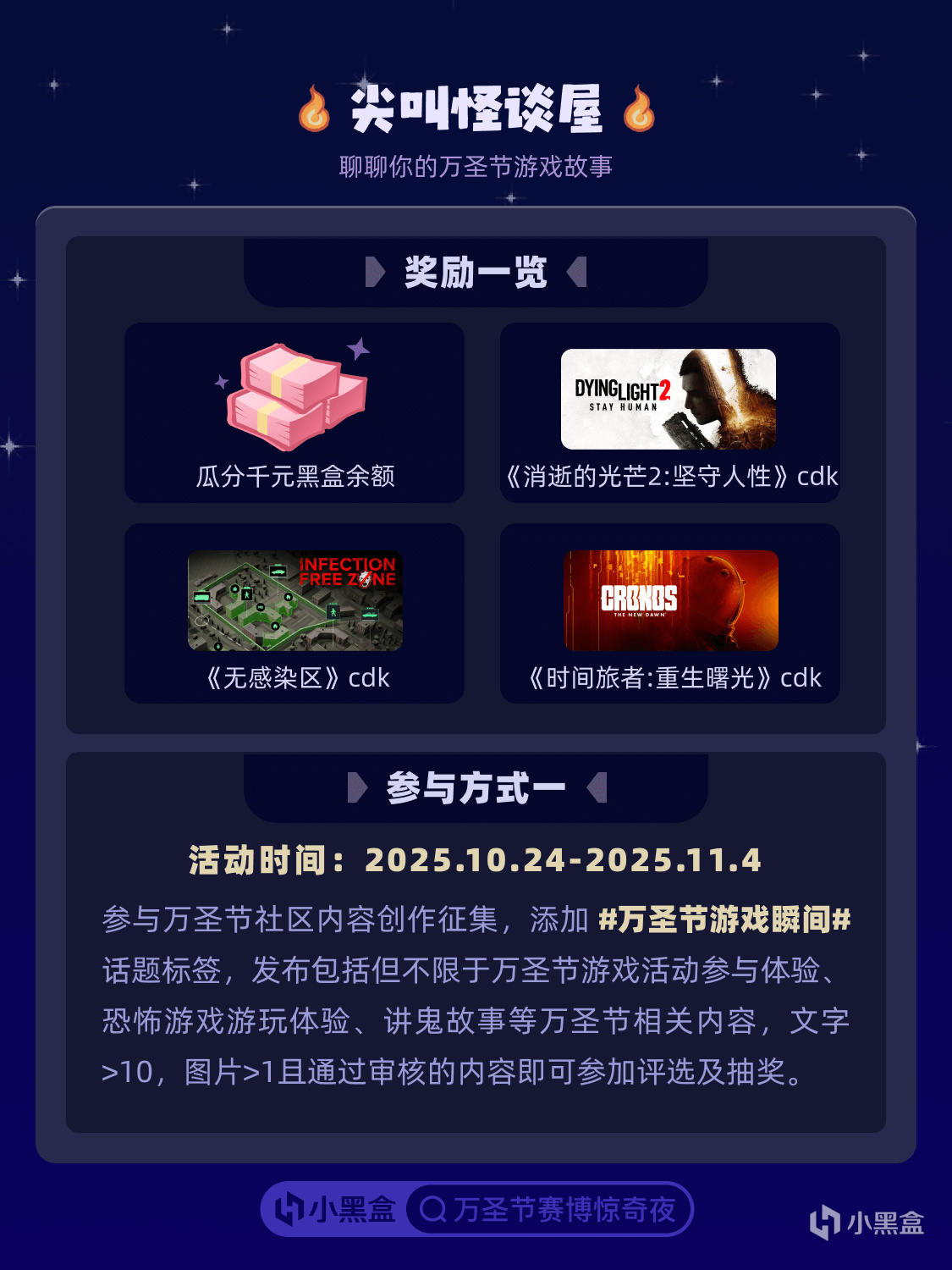 聊聊你的万圣节游戏故事,不仅可以赢取小黑盒为你准备的万圣节惊喜礼包,还有机会被神秘游戏官方翻牌互动哦!