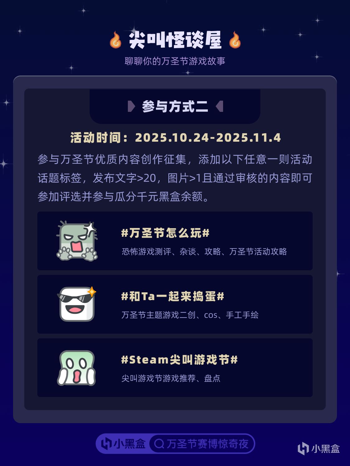 活动期间,带 #万圣节怎么玩# #和Ta一起来捣蛋# #Steam尖叫游戏节# 任意话题发布文字20字,图片1张的优质内容(包括视频),即可参与活动。