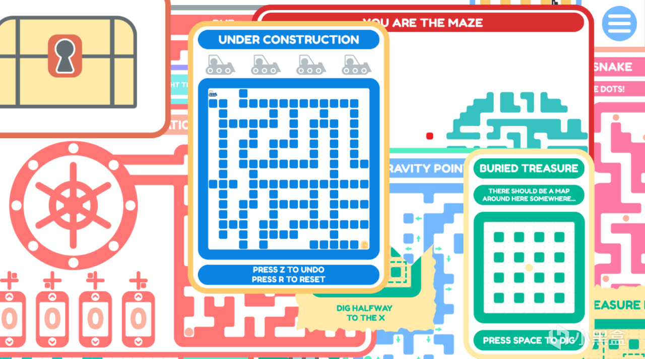 这个就当一个小短评吧,因为是免费的像甜品一样的小游戏也没啥劝退的地方,但确实有意思。游戏的主要内容就是而是个非常有创意且有着不同规则的迷宫谜题,不算很难且很特别好玩。二十个迷宫,而是种不同的玩法,不仅有推箱子、华容道、拼图等经典玩法,也有像是操纵迷宫这种特别有意思的小创意。而且20个谜题是直接摆在你面前的,没有先后顺序,解不出来随时可以换另外一个题,还有一个进度条显示你完成的进度,一题一题慢慢完成然后看到题板消失且进度条涨一点的感觉真滴超爽。