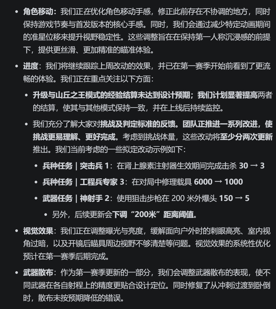 主要优先级更新包括:大幅简化游戏内挑战任务,例如将某些兵种任务的完成要求从30次击杀降低至3次,以减轻玩家负担。同时,游戏将优化武器射击手感和角色移动的流畅度,并修复视觉过亮过暗等问题。