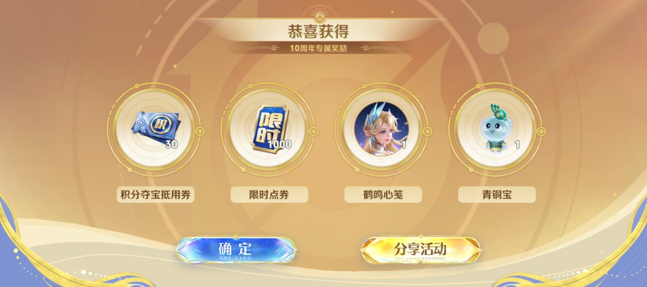 大家好,在今天,《王者荣耀》就迎来了十周年,当然,我也期待今天很久,这款曾经见证了很多人青春的游戏,也已经来到了下一个十年的节点,我几乎卡着点进游戏,12点就进了游戏,然后火速领取了奖励,可以看见此次十周年的奖励很丰厚,不仅在今天能够领取30张的积分夺宝抵用券,还有1000限时点券,以及艾琳皮肤,很多游戏内的道具奖励,关键还免费,错过今天,在等十年。