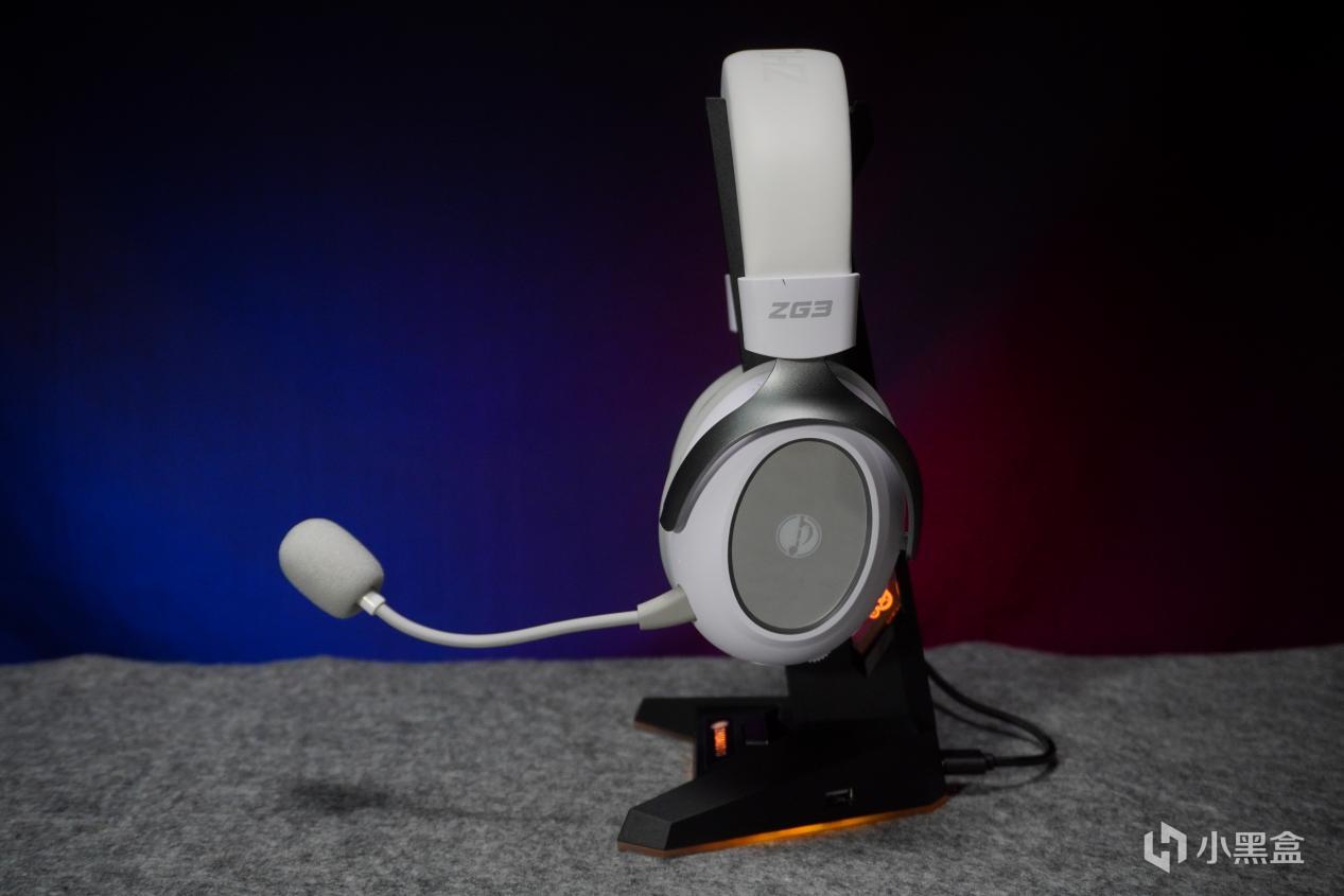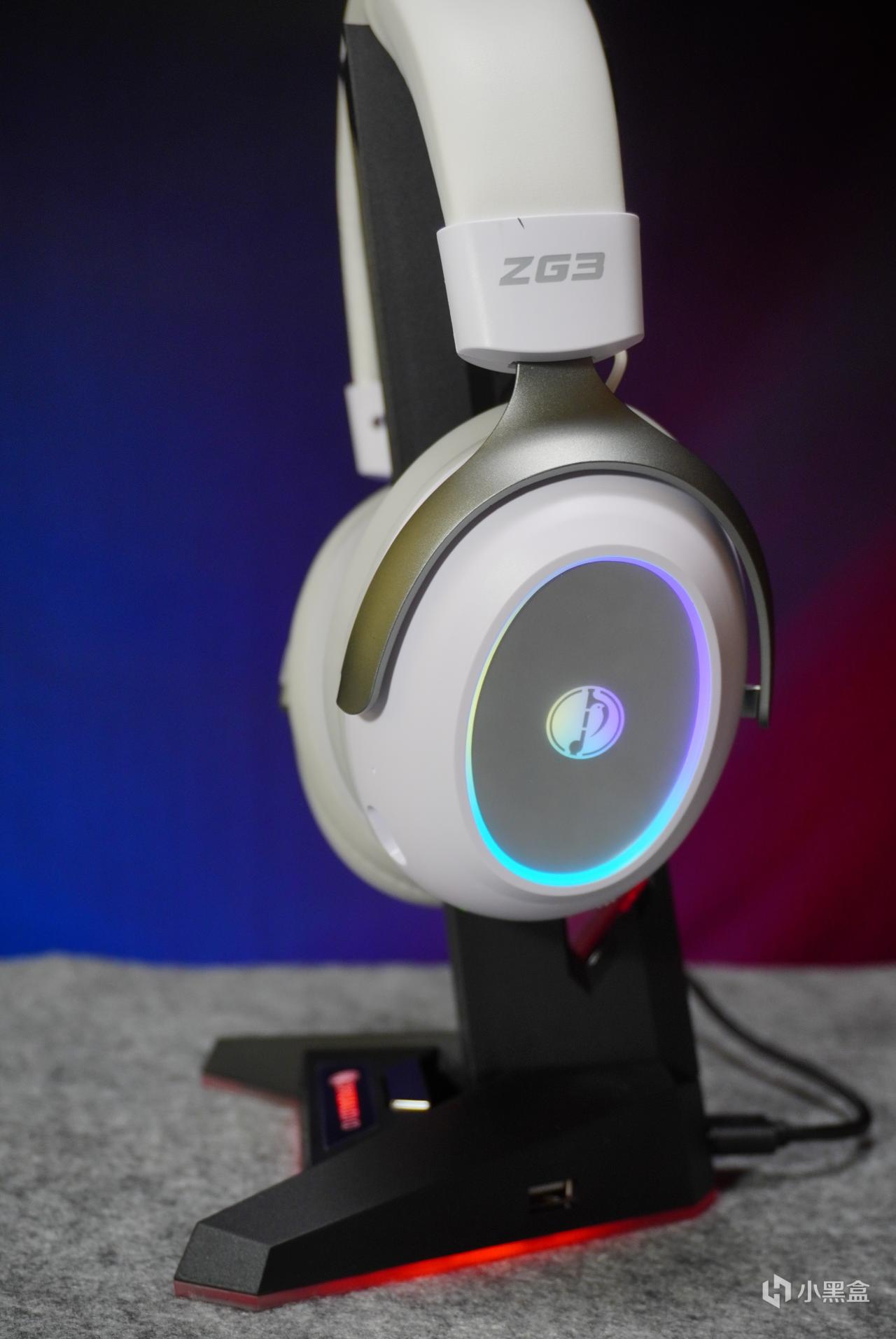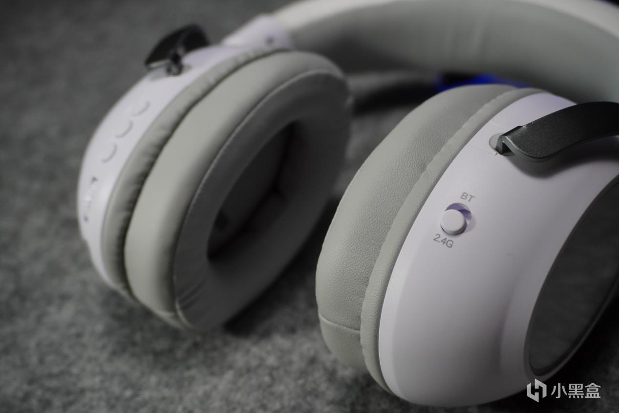 现在基本上都是无线头戴式耳机了,这款耳机本身也是支持无线连接的,在平时使用的时候不会有多余的线材,搭配耳机支架也非常适合桌搭。耳机整体的颜值还是不错的,戴着比较舒服,而且还有RGB灯光。不过有两点值得优化的就是驱动和交互按键了。