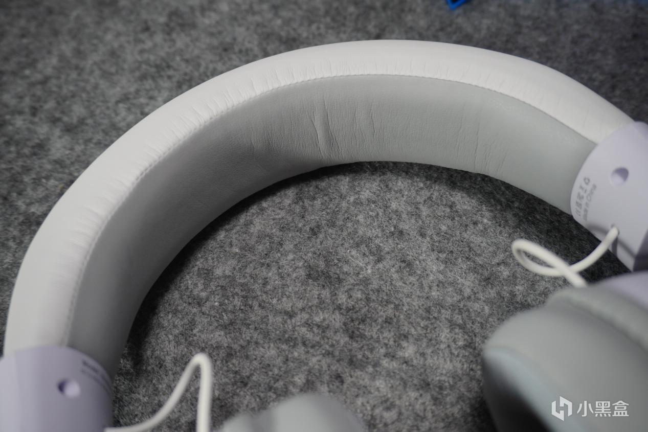 耳机头梁外部采用的是蛋白皮材质,触感偏软,搭配起来舒服不顶头。内部是航空级铝合金材质,整体来说偏轻,长时间使用不容易变形,比较耐用。