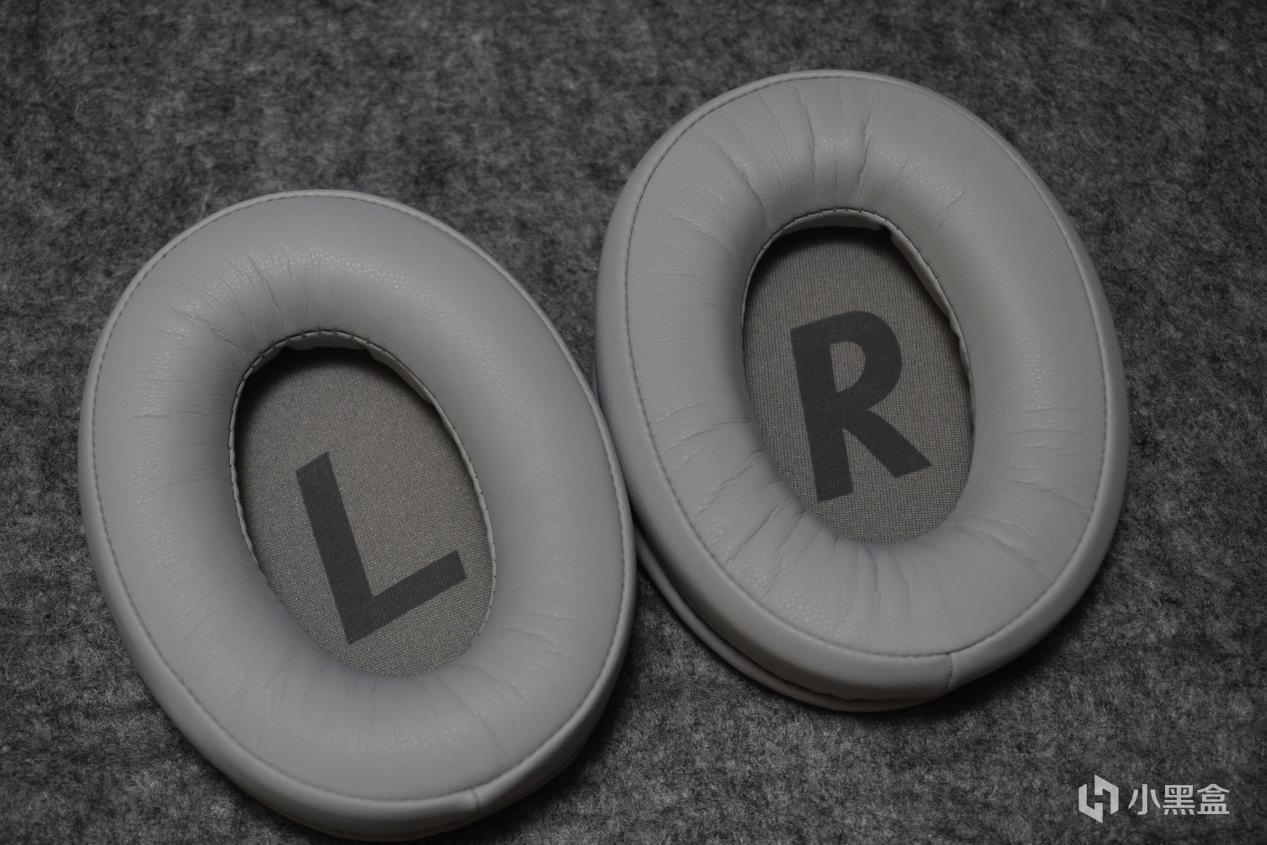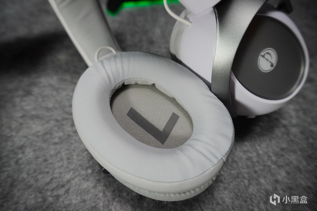 耳罩也是蛋白皮材质,内部采用记忆海绵材质。里面有大写的“L”、“R”,方便区分左右耳,整体偏大,适合大耳朵的玩家使用。回弹能力比较快,也适合戴眼镜游玩,佩戴起来舒服贴耳。