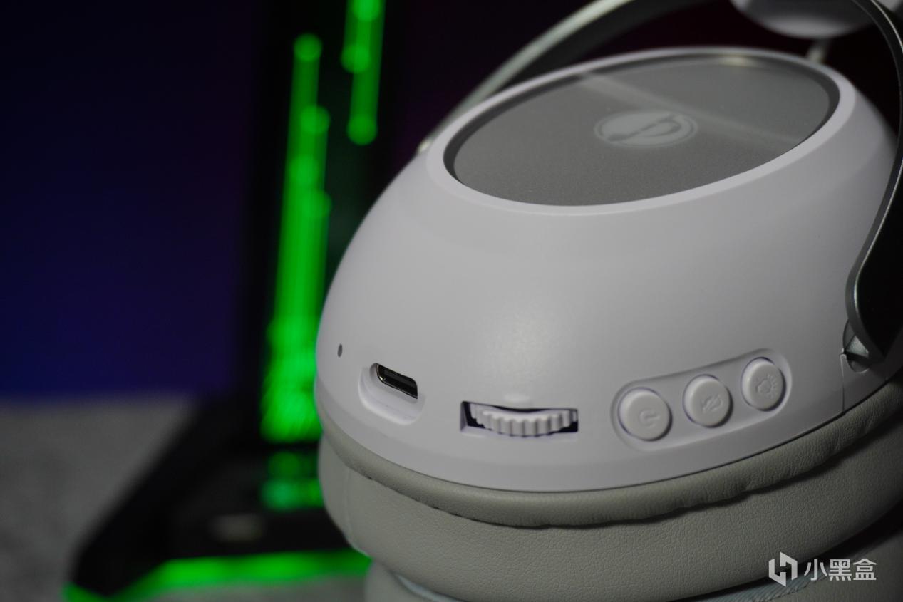 作为一款无线头戴式耳机,耳机上面的接口功能还是比较全面的,可以调节音量的大小,还能一键开关麦克风和耳机的灯光。不过缺点就是这三个按键靠的太近,而且按键的大小一样,比较容易误触。