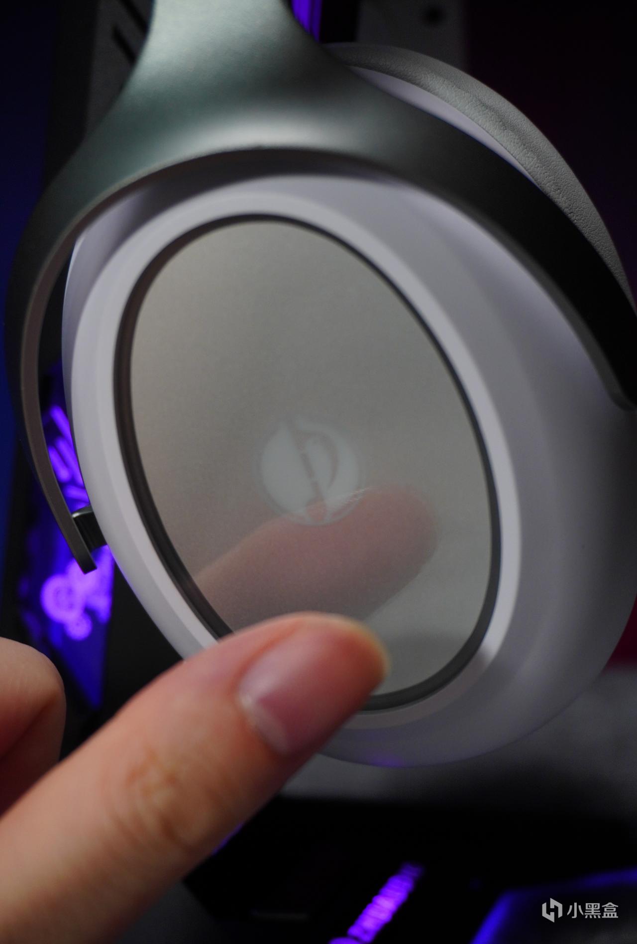 耳机的外壳是一层雾面的镜子,上电后中间的竹林鸟Logo以及边缘处会发出RGB光效,拥有1680万色RGB灯光,颜值还是非常不错的,开灯后电竞氛围拉满。