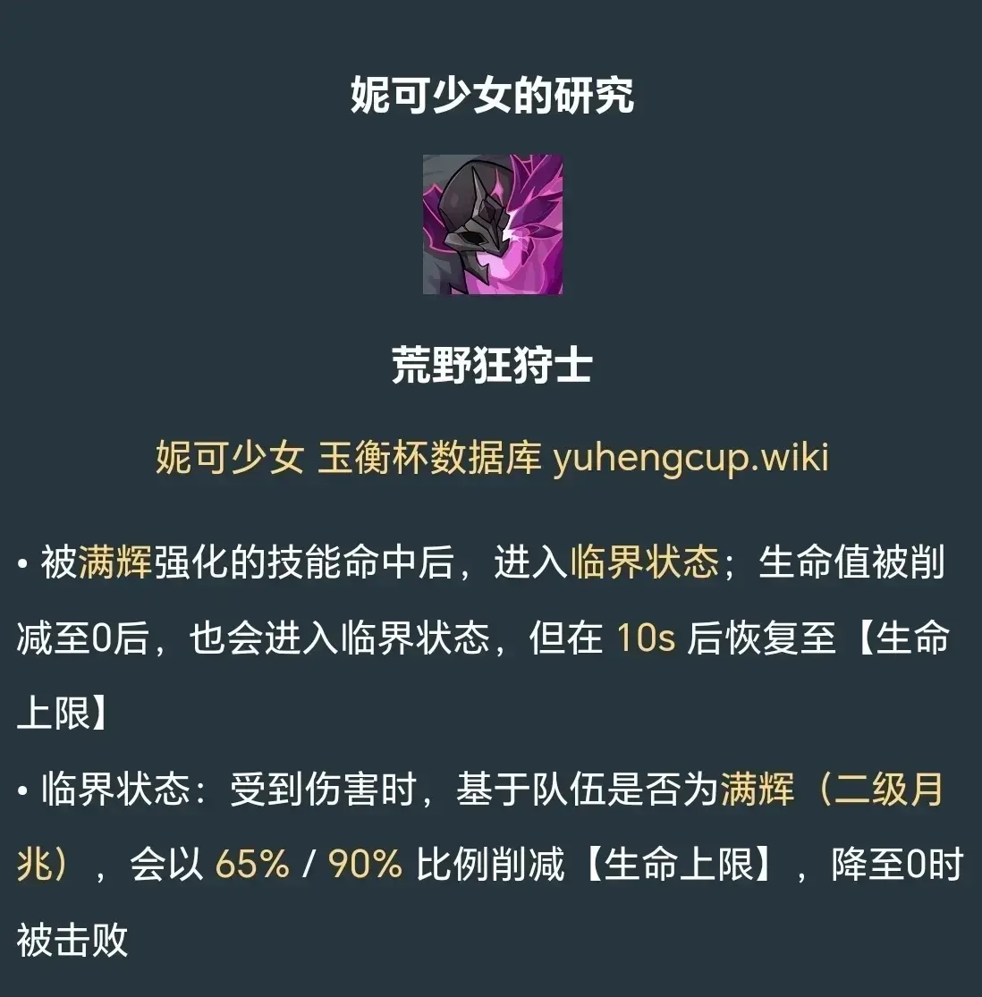2.当怪物被已被满辉强化的技能命中后或生命值为0后进入临界状态,持续10s(经实战,爱诺Q在满辉时仅在第1下时进入临界状态,后续Q的所有攻击不刷新临界状态持续时间。即使用爱诺时每轮会有约4s的非临界状态)。每次进入临界状态时损失10%生命值上限。(此为所有狂猎怪的共同机制)