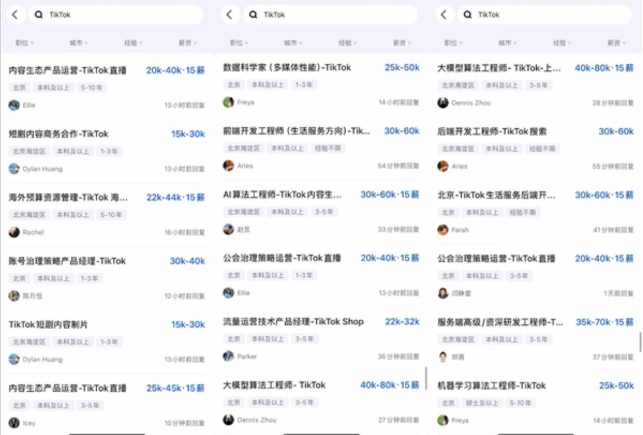 这位90后女高管2014年毕业于天津大学,曾任职于普华永道、Uber,2016年加入字节跳动,是抖音早期核心成员。与此同时,TikTok正加快招聘中高端人才步伐。TikTok在脉脉上发布多个百万年薪岗位,工作地点覆盖北京、上海、深圳、杭州等国内城市及欧美、东南亚等海外地区。