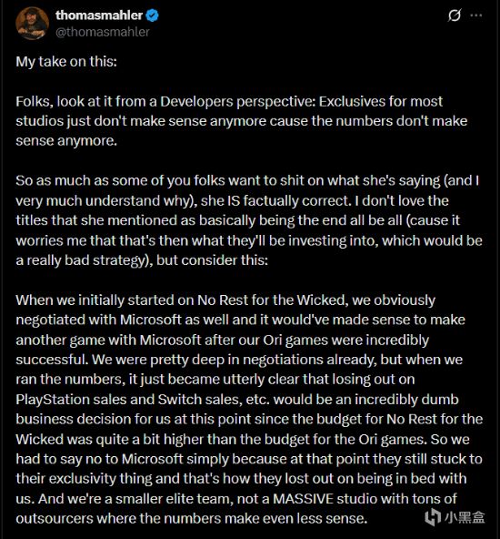 Xbox 女总裁 Sarah Bond “独占游戏已过时” 的言论刚引发热议,《奥日》《恶意不息》开发商 Moon Studios 联合创始人 Thomas Mahler 便以开发者身份强势站台 , 他结合自家拒绝微软独占的亲身经历,用成本账和行业现状印证:“对多数工作室来说,独占模式已彻底不合理,数据早给出了答案。”