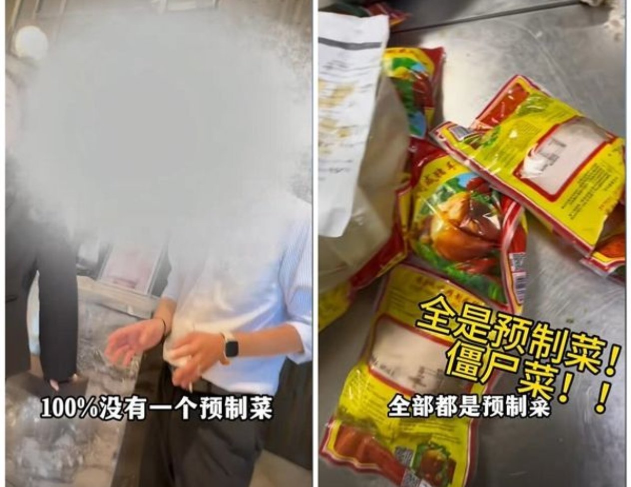 然而博主进入后厨发现,橱柜上摆放着大量包装好的预制菜品,包括婚宴菜单上的德国咸猪手、八宝饭等,菜单标注的新鲜虾实际为冷冻熟虾。事件曝光后,酒店向博主发出律师函,要求删除“不实言论”并公开道歉。