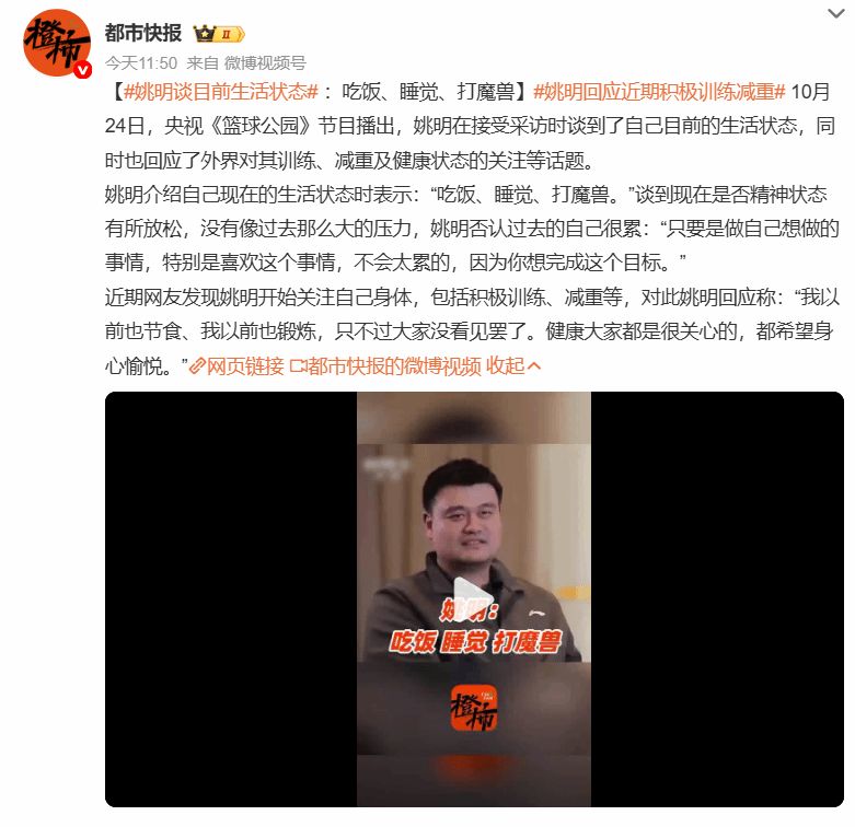 面对主持人关于精神状态是否更为放松的提问,姚明表示:“压力来自于你想做成这件事。所以你说没有压力,实际上就是因为现在的目标就是吃饭、睡觉、打魔兽。”他强调,只要是做自己喜欢的事情,就不会感到太累。针对外界对他近期健身减重的关注,姚明回应称:“我以前也节食、以前也锻炼,只不过大家没看见罢了。”他进一步表示,健康是大家都关心的,每个人都希望身心愉悦。