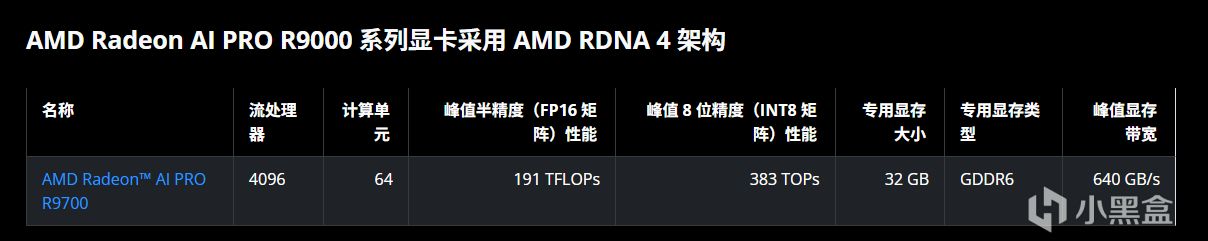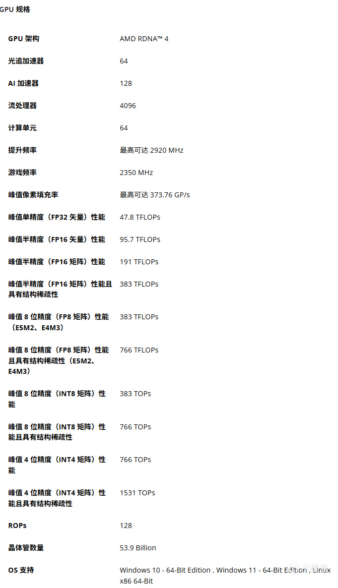 架构与算力:内置 64 组 CU 计算单元、4096 个流处理器,配备 128 个 AI 加速单元及 64 个 RT 光追单元,可提供 1531 TOPS 的 INT4 峰值算力(支持结构稀疏性优化),同时具备 47.8 TFLOPs FP32、95.7 TFLOPs FP16 计算性能。